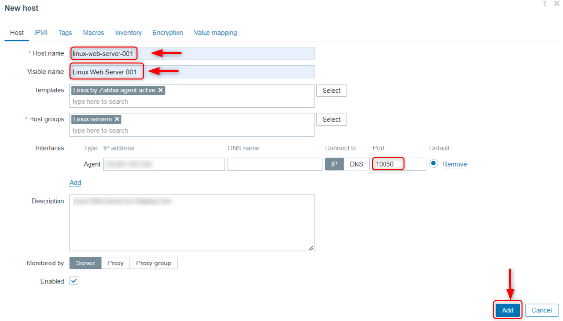 Navigate to Monitoring > Hosts > Create host. Enter the VPS IP and hostname, assign a Group, and link the Linux agent template.